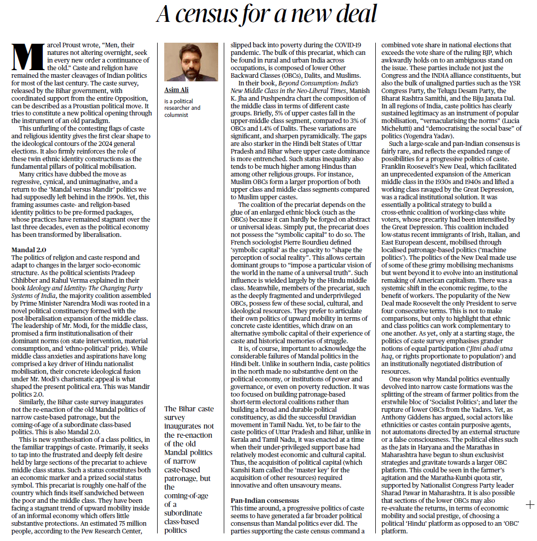 - The recently released caste survey data by the Bihar government has once again brought the issue of caste census to the forefront. While the Census of India has been publishing data on Scheduled Castes and Scheduled Tribes, there has been no estimate for the population of Other Backward