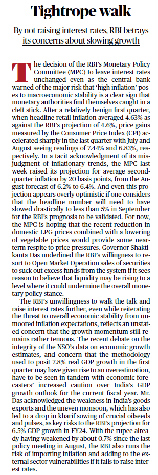 - After a relatively benign first quarter, when headline retail inflation averaged 4.63% as against the RBI's projection of 4.6%, price gains measured by the Consumer Price Index (CPI) accelerated sharply in the last quarter with July and August seeing readings of 7.44% and 6.83%, respectively.