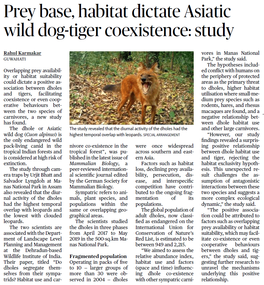 - Overlapping prey availability or habitat suitability could dictate a positive association between dholes and tigers, facilitating coexistence or even cooperative behaviours between the two species of carnivores, a new study has found.